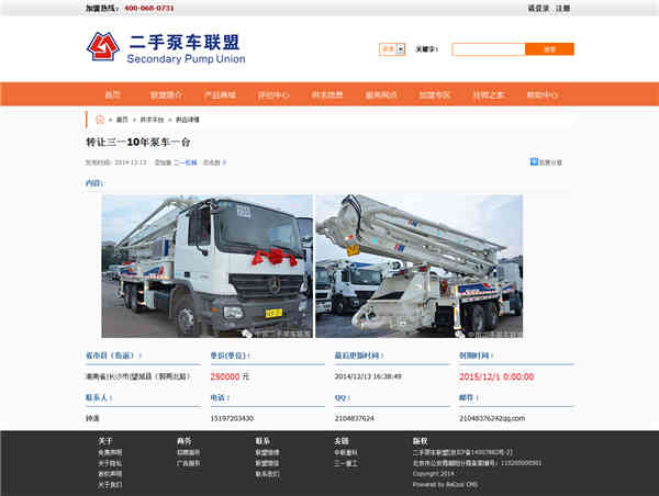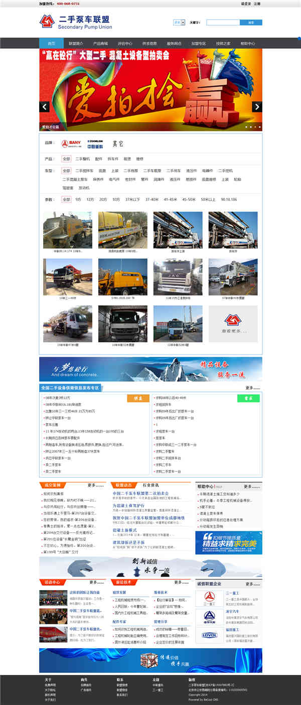 中国二手泵车联盟于2014年8月8日成立,总部位于湖南省湘潭市经开区,联盟致力于整合全国二手混凝土泵车设备资源,促进流通,高效配置,为行业用户提供最具价值的服务!故而建设开发了中国二手泵车联盟网站,集商品展示、供求信息发布、泵车评估、行业资讯等功能于一体,实现二手泵车在线评估、供求信息对接、整车及配件买卖等相关操作。