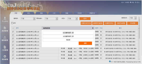 房源管理中包含房屋添加、授权物业及指挥部、设定是否手动选房等功能,支持单个和批量操作、增删改查等功能。并提供详细的房屋日志供查询。