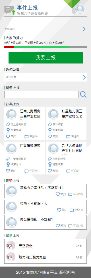 事件上报前台主要功能有:提交上报、搜索上报、查看获奖上报、查看最赞上报、查看最新上报等操作。提交上报操作前须关注“九华人”微信公众号,并进行帐号注册后才可进行操作。