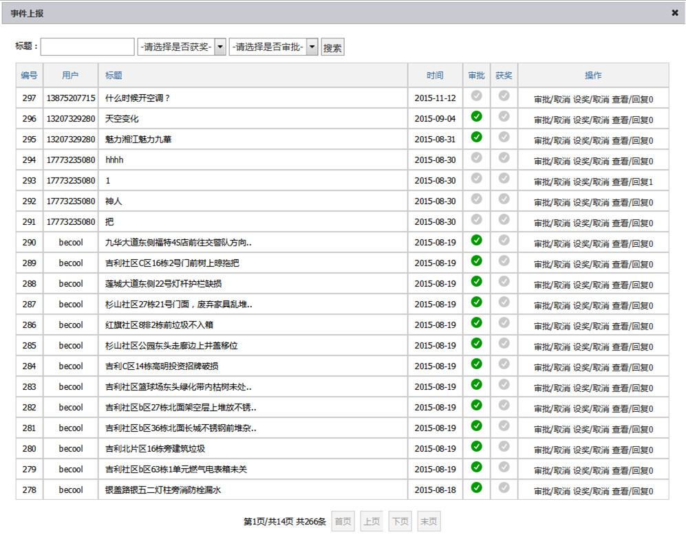 事件上报后台主要功能有:收集所有上报数据,并进行查看上报、回复上报、上报审核、上报设奖等操作。