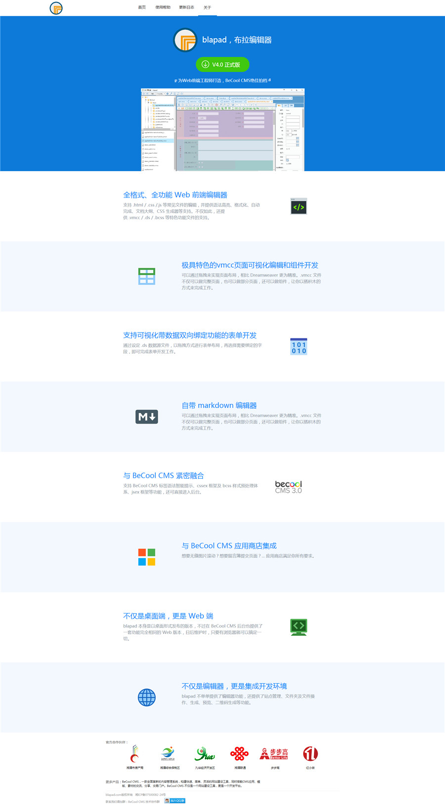 布拉编辑器是 BeCool CMS 最佳开发伴侣,为其量身定做了很多功能,当然,在不采用 BeCool CMS 作为后台的网站,也可以采用布拉编辑器,是前端开发的一枚利器。