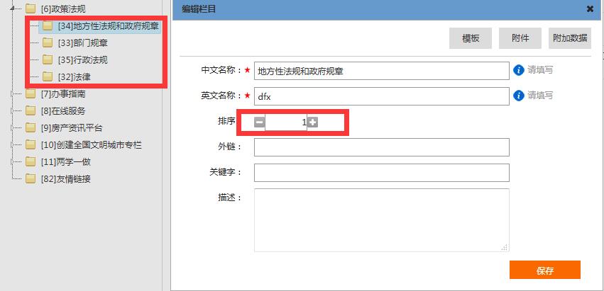 3、在栏目编辑窗中找到“排序”进行排序,为防止规则与前台不符,排序规则与前台模板人员进行沟通,两边一致即可。如下图: